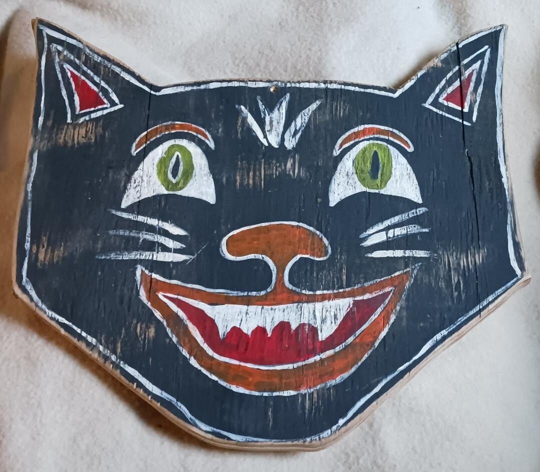 This is a hand made vintage wood cut out black cat face. It measures about 13 iches wide and 10 inches tall. I am able to make any size you need though.